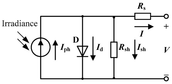 Figure 1 shows the SD PVC model (Rsh is the parallel shunt resistance of the diode, and Rs is the divider resistance of the PVC). The output I of the PVC is calculated using Equation (1).