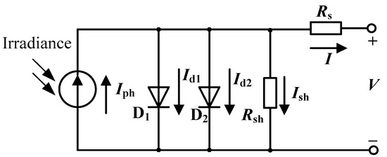 In Equation (1), is the current generated by solar illumination, is the current that passes through the diode, and is the current that passes through Rsh that reflects the cut-off of the p–n junction of the PVC. and are calculated using Equations (2) and (3), respectively.