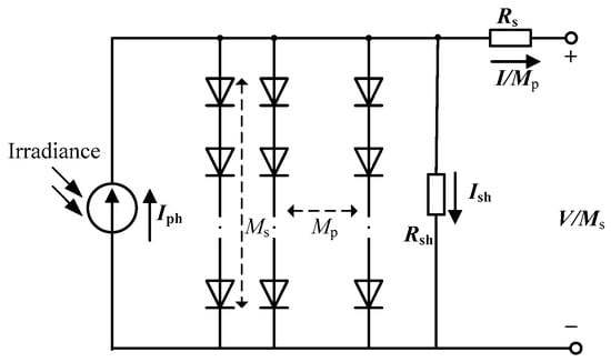 A PV module is composed of PVCs connected in parallel or in series. Figure 4 shows an equivalent SD circuit of a PV module. The output I of the PV module is calculated using Equation (11).