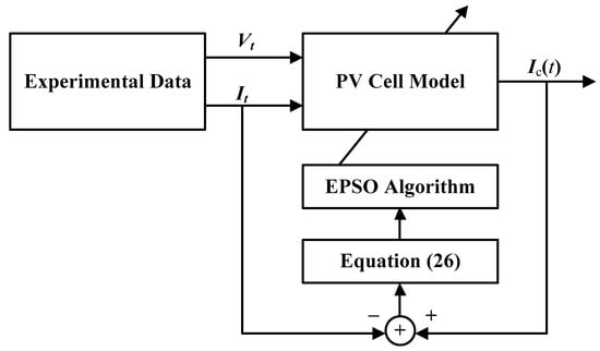 Parameter identification is a process that minimizes the MSE between measured and calculated data by adjusting the model parameters. Manifestly, the smaller is, the more accurate the model is. In this study, the code of the PVC parameters is treated as a candidate solution θ, and the EPSO algorithm is employed to calculate the minimum value of each of Equations (22)–(26). Algorithm 1 summarizes the pseudocode of the implementation of the EPSO algorithm for PVC parameter identification. Figure 7 shows the flowchart of PVC parameter identification using the EPSO algorithm.