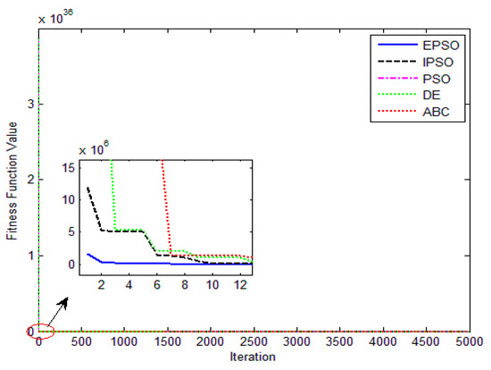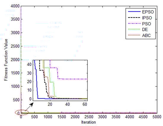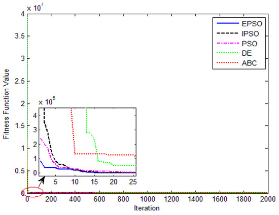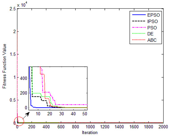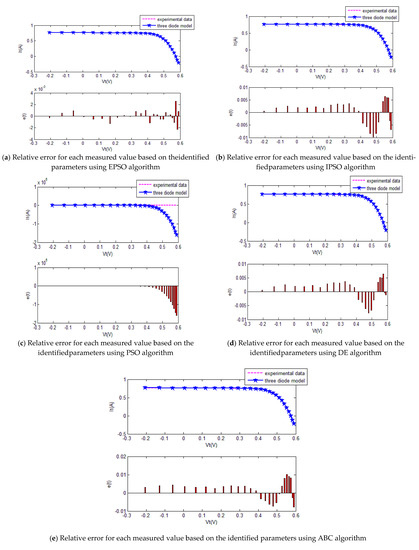 The convergence curves of the various algorithms in Figure 14 were plotted based on the average values of obtained from 20 independent operations. Obviously, the EPSO algorithm converged faster than the other algorithms. A comparison of the algorithms in terms of the convergence values and computational times are presented in Table 7. The PSO algorithm had the shortest computational times but the worst convergence values, whereas the computational times of the ABC algorithm were nearly six times those of the EPSO algorithm. In addition, it is worth noting that the convergence values of the EPSO algorithm were the lowest of all the algorithms used to identify the parameters of the single-diode model. This finding further demonstrates that the EPSO algorithm outperformed the other algorithms in terms of convergence. A comparison of the I–V characteristic curves in Figure 15, the P–V characteristic curves in Figure 16, and the output I (Ier) values in Table 8 show that the I–V and P–V characteristic curves and the Ier values of the PVCs estimated by the proposed algorithm were closer to the measured data.