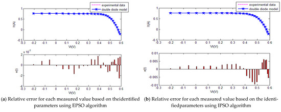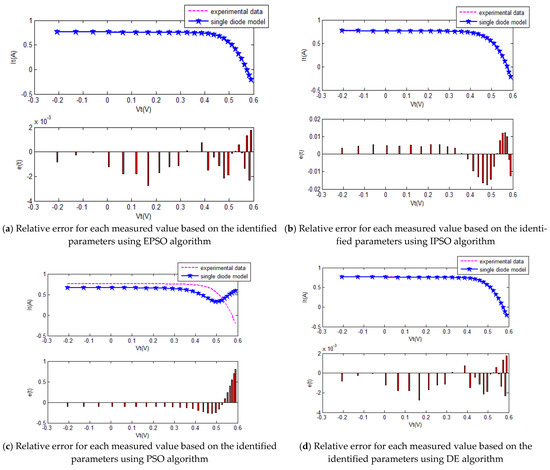 The convergence curves of the various algorithms in Figure 8 were plotted based on the average values of obtained from 20 independent operations. Evidently, the EPSO algorithm converged faster than the other algorithms. A comparison of the algorithms in terms of the convergence values and computational times is presented in Table 3. The PSO algorithm had the shortest computational times but the worst convergence values. The EPSO and DE algorithms exhibited the same convergence values for the SD model, whereas the computational times of the DE algorithm were nearly five times those of the EPSO algorithm. In addition, it is worth noting that the convergence values of the EPSO algorithm were the lowest of all the algorithms used to identify the parameters of the single-diode model. This finding further demonstrates that the EPSO algorithm outperformed the other algorithms in terms of convergence. A comparison of the I–V characteristic curves in Figure 9, the P–V characteristic curves in Figure 10, and the output I (Ier) values in Table 4 show that the I–V and P–V characteristic curves and the Ier values of the PVCs estimated by the proposed algorithm were closer to the measured data. This finding suggests that the EPSO-based PVC parameter identification algorithm has a higher identification accuracy.