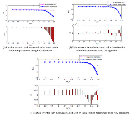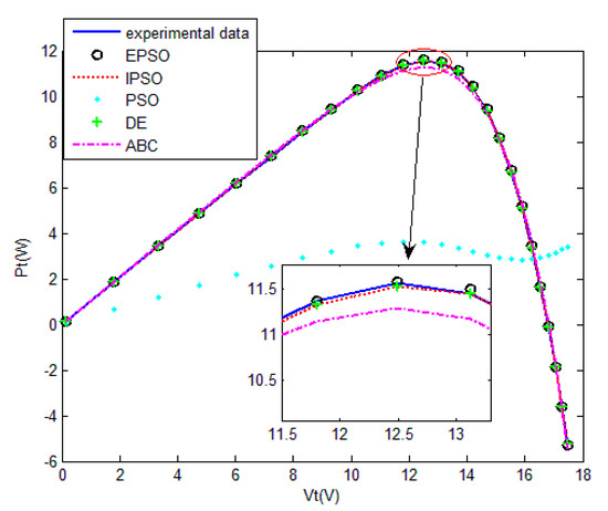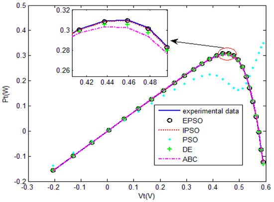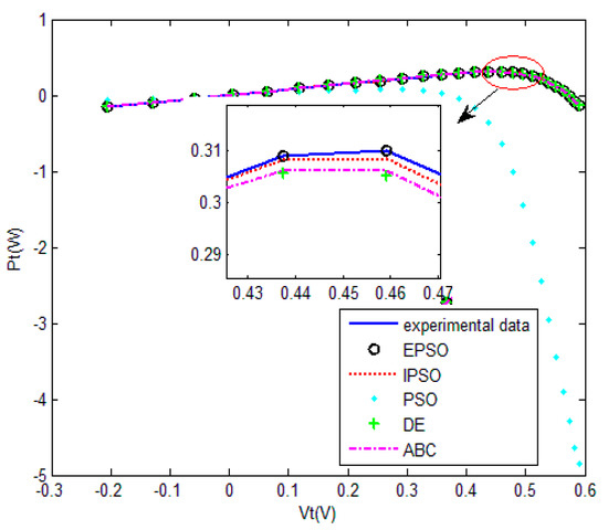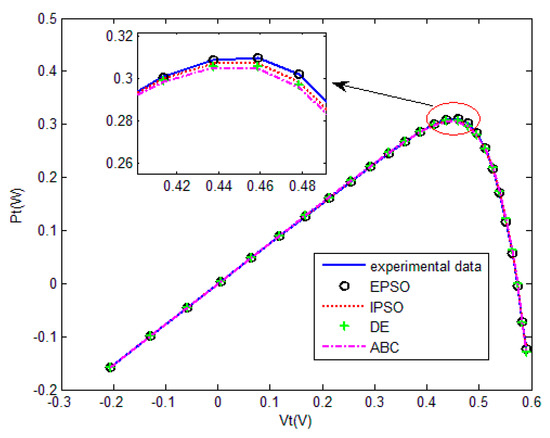 The convergence curves of the various algorithms in Figure 11 were plotted based on the average values of obtained from 20 independent operations. Evidently, the EPSO algorithm converged fastest. A comparison of the algorithms in terms of the convergence values and computational times is shown in Table 5,where the PSO algorithm had the shortest computational times but the worst convergence values. The computational times of the PSO algorithm were nearly three times those of the EPSO algorithm. In addition, it is worth noting that the convergence values of the EPSO algorithm were the lowest of all the algorithms used to identify the parameters of the double-diode model. This finding further demonstrates that the EPSO algorithm outperformed the other algorithms in terms of convergence. A comparison of the I–V characteristic curves in Figure 12, the P–V characteristic curves in Figure 13, and the output I (Ier) values in Table 6 show that the I–V and P–V characteristic curves and the Ier values of the PVCs estimated by the proposed algorithm were closer to the measured data.