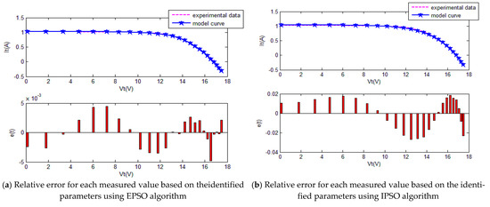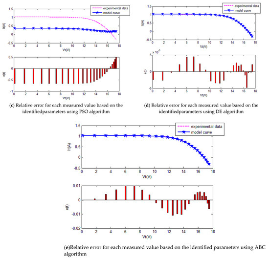 The convergence curves of the various algorithms in Figure 17 were plotted based on the average values of obtained from 20 independent operations. Evidently, the EPSO algorithm converged faster than the other algorithms. A comparison of the algorithms in terms of the convergence values and computational times in Table 9 shows the following. The PSO algorithm had the shortest computational times but the worst convergence values. The EPSO and DE algorithms exhibited the same convergence values for the the PV module, whereas the computational times of the DE algorithm were over five times those of the EPSO algorithm. In addition, it is worth noting that the convergence values of the EPSO algorithm were the lowest of all the algorithms used to identify the parameters of each model. This finding further demonstrates that the EPSO algorithm outperformed the other algorithms in terms of convergence. A comparison of the I–V characteristic curves in Figure 18, the P–V characteristic curves in Figure 19, and the output I (Ier) values in Table 10, show that the I–V and P–V characteristic curves and the Ier values of the PVCs estimated by the proposed algorithm were closer to the measured data. This finding suggests that the EPSO-based PVC parameter identification algorithm has a higher identification accuracy and the other algorithms.