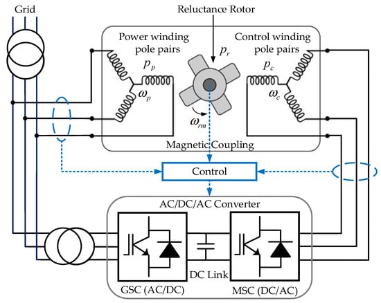 The primary winding has a fixed-frequency voltage with roughly constant-magnitude (due to its connection to power grids) [25] while, the control winding is supplied from a converter with variable voltage and frequency [46], in which the frequency is changed by the MSC [47]. The power converter unit can absorb energy based on the machine’s condition. However, when BDFRM is used as pump drives, the power converter unit absorbs energy only during start-up [48] since for most of the pump applications, the range of the speed variation is roughly 70–100% of the nominal speed.