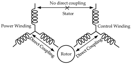 In BDFRM and other BDFM topologies, direct coupling between the windings must not be established. Because the power drained from power grids by the control winding can be reversed to power grids via the power winding. Hence, the machine cannot be controlled when there is a direct coupling between them. This is while the windings have indirect coupling via the rotor. In other words, both the windings have direct coupling with the reluctance rotor, separately [43]. Figure 3 shows the mentioned coupling concept in BDFRM.