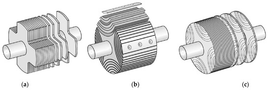 Unlike BDFM, the BDFRM rotor has no winding. However, the rotor design is more complicated in this machine technology [56,57,70]. The BDFRM rotor design is based on increasing its saliency to improve machine operation [47]. The BDFRM’s rotor is designed in different types according to its application. Figure 6 shows different types of BDFRM’s rotor. It should be noted that the rotor velocity is independent of the rotating field speed [8]. It is revealed that the axially-laminated rotor type results in high iron losses of the rotor, which have negative effects on the efficiency, as well as the thermal stability of BDFRM [8].