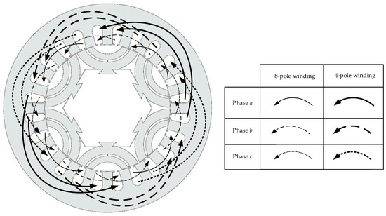 As mentioned, in BDFRM, both windings are mounted on the stator. The circuit of stator windings is investigated in [43,45,75,76]. Additionally, the winding diagrams of the stator with six and two poles for power and control windings, respectively, are presented in [47].