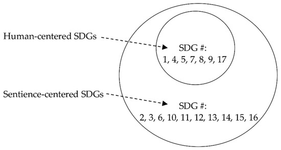 Since human beings are sentient beings, this division may be illustrated by a Venn diagram as follows (Figure 1), where the set of human-centred SDGs constitutes a subset of the sentience-centred SDGs: