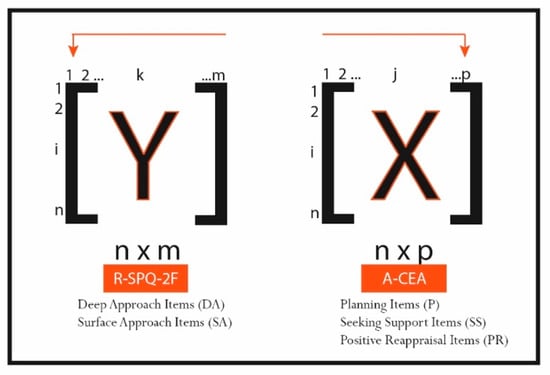Finally, a restricted ordination method called canonical correlation analysis (CCA) [] was used to analyze the relationship between learning approaches and coping with academic stress. Canonical Correspondence Analysis (CCA) is a nonlinear multivariate direct gradient analysis method that combines correspondence analysis with multiple regression analysis. This method is traditionally used to evaluate the ambient gradients in ecological studies, and it is able to easily identify the eventual causal relationship between the species distributions and the ambient variables. In our case it was used to evaluate the connection between learning approaches and coping with academic stress. Two data matrices were required for the CCA for the 1012 subjects, one containing information about the learning approach item and the other containing information relating to the items concerning coping with academic stress (Figure 1). The results are presented in an ordination plot, where the scores for the coping with academic stress items are graphically represented using vectors. The coordinates of the arrows are the values of the arrows on the two best synthetic gradients. CCA produced an ordination based on estimated values of the coping with academic stress items depending on the learning approach items. Learning approaches can thereby be explained via a model in which the explanatory variable is a linear combination of the items that evaluate coping with academic stress.