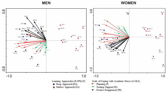 The resulting ordination plot (see Figure 2) shows that there was a strong association for male students among the items of the various dimensions of the A-CEA. Among female students, items forming part of positive reappraisal had a strong association with items of the planning dimension, meaning that these dimensions were not differentiated. It is striking that both male and female students coped with academic stress by using a deep learning approach. This assertion is important because it is known that the deep learning approach is a strategy by which students extract meaning and understanding from course content [] thanks to it is a holistic approach to learning [], which means that sustainability topics can be addressed through the intellect, emotions and values []. Therefore, deep learning is relevant in the context of education for sustainability as the range of environmental, social and economic issues require making connections between different aspects using holistic ways of thinking. A measure of the success of implementing sustainability content in the curriculum could be the use of deep learning strategies by students [].