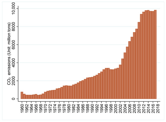 According to the Kaya Identity, global warming is affected by economic growth and carbon emission intensity [2]. Some researchers believe that high emissions derive from rapid economic growth and the use of fossil fuels [3]. Combined with the actual conditions of China’s economic development, the reason why China produces so much carbon dioxide emissions is that since the reform and opening up in 1978, the rapid outward development of China’s economy has mainly depended on the high input and consumption of land, labor, capital, and other resources, especially fossil energy. Therefore, before 1980, the growth of carbon emissions was slow, but with the consumption of huge fossil fuels resulting from the rapid development of China’s economy, growth later rose sharply. However, as the Chinese government gradually realized the seriousness of environmental problems and attempted a series of environmental governance measures, China’s carbon emissions were effectively slowed down after 2000. Unfortunately, they are still at a high level.