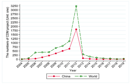 With the Kyoto Protocol taking effect in 2005, China’s CDM projects began to develop. According to CDM project operation-management measures issued by China, development should focus on areas such as new and renewable energy, energy conservation and efficiency improvement, and the recycling and utilization of coal-bed methane. Figure 3 shows the line graphs of the trends of CDM projects in China and the rest of the world (solid line, China’s trend; dotted line, global trend). After the world’s first registered CDM projects in 2004, the number of China’s new registered CDM projects has basically maintained the same trend with that of the rest of the world: the boom period of China’s CDM projects was from 2007 to 2012; especially in 2012, the number of China’s new registered CDM projects was 1819, accounting for more than 56% of the global total, which was 3233, from which we can see China’s dominance in the CDM market. However, after the Kyoto Protocol expired in 2012, CDM project implementation, both globally and in China, significantly slowed down, and the number of new registered CDM projects dramatically decreased. In 2012, the Executive Council of the United Nations CDM Projects implemented a strict policy on the CDM projects, which increased the difficulty of project registration, caused the review process to be more complicated, and its direct result is a sudden drop in the numbers of CDM project in China and elsewhere. This drop directly led to the uncertainty of the CDM projects’ implementation after 2012, making the investment more cautious (Cui et al., 2020; Maraseni, 2013) [32,33]. At the same time, as the largest implementer of CDM projects, the EU drastically cut the carbon quotas of CDM used in the emissions trading system from 2012 to 2020, which further led to a reduction in the number of projects (Koch et al., 2014) [34]).