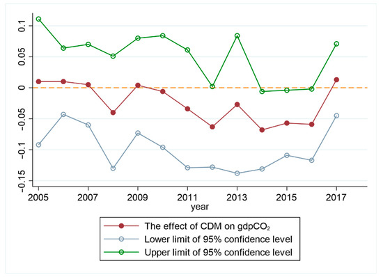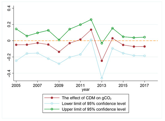 Figure 4 and Figure 5 show the long-term dynamic effect of CDM project implementation on emission reduction according to the results of Columns (2) and (4) in Table 4. Whether the explained variables were measured by carbon dioxide emissions per unit of GDP or the growth rate of carbon dioxide emissions, the emission-reduction effects were not significant in the first five years, but after 2011, they gradually became significant, and this effect became more obvious with time. From this perspective, CDM project implementation has a long-term dynamic impact on carbon emissions.