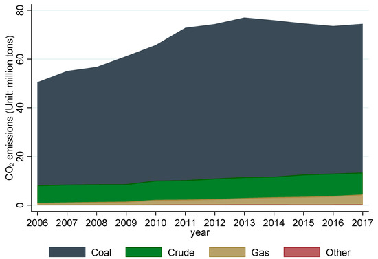 The most direct consequence of the high consumption of China’s three major fossil-energy sources is the huge carbon emissions. Figure 7 shows the trend of carbon emissions caused by the different energy-consumption levels from 2006 to 2017, which show that carbon emissions had a rising trend, and their main origin was the consumption of the three major fossil-energy sources. Specifically, carbon emissions caused by consumption of the three major fossil-energy sources, accounting for 99% of the total carbon emissions in China; among them, coal accounts for the largest proportion, more than 80%. Energy CDM projects can directly promote the use of clean energy, thereby reducing the consumption demand of the three major fossil-energy sources. China has implemented a large number of energy CDM projects, accounting for 81% of the total. On the above basis, from the perspective of energy substitution, the carbon emission reduction effect of China’s CDM projects may be achieved by increasing the use of clean energy and reducing the use of fossil energy.