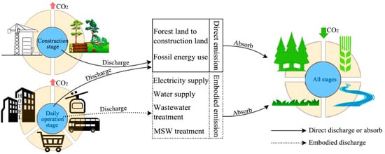 where Cannual-emissions is the annual emissions of the scenic spot; CC is the average annual CO2 emissions of the infrastructure construction stage; and CE is the annual CO2 emissions from energy consumption, which occurred in both the infrastructure construction stage and the daily operation stage. CD is the annual embodied emissions, including indirect emissions due to electricity, water, wastewater, and municipal solid waste (MSW) treatment.