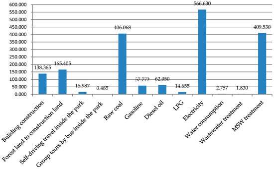CD is the annual water and MSW embodied emissions including three parts: indirect CO2 emissions related to the water supply, wastewater treatment, and MSW treatment. Through a survey of the park’s administrative committee and tourism enterprises, the annual water consumption data and garbage removal data were obtained. This paper summarizes the energy consumption embodied CO2 emissions related to water extraction, water production, and water transport based on the existing literature []. During the water treatment process in the sewage treatment plant, the biological treatment process generates CO2 emissions. CO2 emissions are also generated due to the electricity consumption during the treatment process. Based on the existing literature, the CO2 emissions from wastewater treatment are 0.837 kg CO2 m−3. Since 2017, the treatment of garbage in Shenyang has transitioned to centralized cleaning, incineration, and power generation. According to the literature, the calculated CO2 emissions coefficient per unit of garbage is 0.561 kg CO2 kg−1 [].