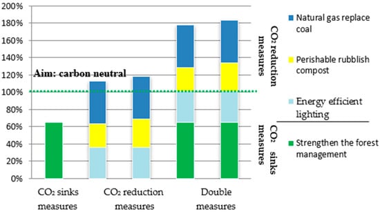 Many emission reductions measures could improve the carbon balance of forest tourism scenic spots. In accordance with the findings on the CO2 budget, measures related to electricity consumption will the most efficient. Shenyang National Forest Park has a total indoor building area of 13,540 m2 and an outdoor road and landscape area of 96,650 m2. According to the lighting power density value (LPD limit, Wm−2) specified in the City Night Lighting Technical Specifications, the general commercial business lighting power density is 12 W m−2 and the road lighting density is 0.6 W m−2. Thus, for a daily lighting time of 4 hours, it is estimated that the electricity consumption is 321,816.120 kW·h. If LED lighting is used, it is estimated that the electricity consumption by lighting will be decreased by 50% []. After these renovations, it is expected that CO2 emissions will be reduced by 181.665 t CO2 and will improve the carbon balance by 35.997%.