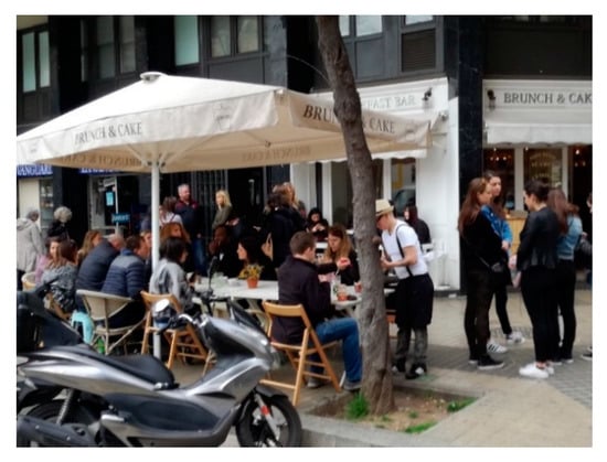 In Barcelona, the number of terraces located in the public space has recently increased very rapidly, under the influence of multiple factors: mild climate, tourism growth, the implementation of the anti-tobacco law [22], widening of sidewalks, prioritization of the pedestrian realm in the public space [23,24], rise of rental prices and the number of food-related businesses and, more recently, COVID-19 restrictions. This increment has caused a climate filled with discussions and even conflicts regarding this issue.