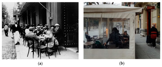 (a) Hotel Oriente’s terrace on Rambla dels Caputxins. Photography by Jesus Fraiz Ordóñez. Barcelona, 1907–1908; (b) terrace in Enrique Granados Street during winter.