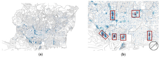 (a) Map of Barcelona’s restaurant business activity [25]; (b) indication of the analyzed zones.