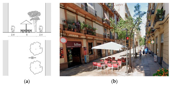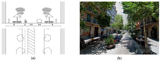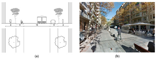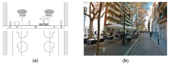 (a) Plan and section of Enrique Granados Street; (b) street view of Enrique Granados Street.