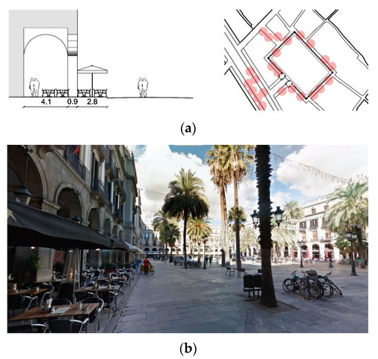 (a) Plan and section of Plaça Reial; (b) street view of Plaça Reial.