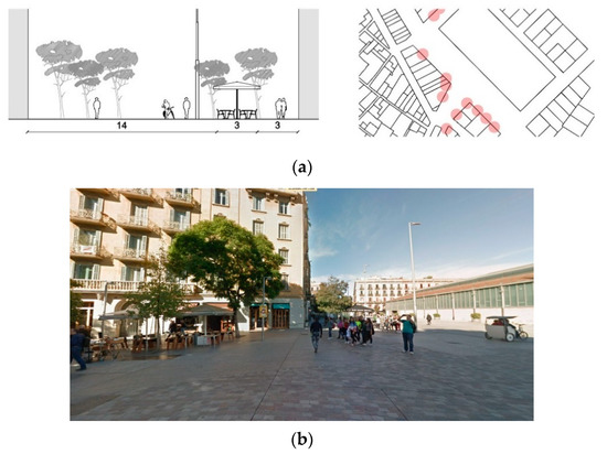 (a) Plan and section of Rambla del Poble Nou, upper section; (b) street view of Rambla del Poble Nou, upper section.