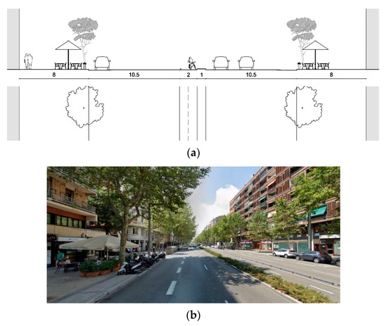Located in the district of central Eixample, Enrique Granados is an example of a vertical axis in the Barcelona grid, with a NW–SE orientation. It connects la Diagonal with Gran Via, two major metropolitan Barcelona avenues. The street has a constant width of 20 m, like all regular streets of l’Eixample grid, but with different section configurations. Although some parts of the street are pedestrianized, the most common section holds 50% of the surface dedicated to pedestrians, organized in two wide lateral walkways, one direction car lane, a two-way bike lane and a central parking area, which alternates bicycles, motorcycles and cars (Figure 4).