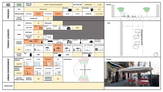 Each spreadsheet includes 21 attributes organized in three sections: premises data, terrace elements and urban environment. It also contains graphical information: plan and section, an image of the terrace and an environment conceptual diagram describing the relationship with the surroundings (Figure 12).