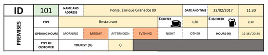 The first section, premises data, addresses the eight following fields: name and address, date and hour of observation, type of business, price of coffee, price of beer (33 cl), opening schedule and approximate tourist/local client percentage. The price of coffee and beer are used as proxies of the business economic level, as they tend to be sold at all types of terraces, be it restaurants, bars or cafes. Every zone is codified with an ID, from 1 to 6, and every terrace has a number of two digits preceded by the ID of its zone (total of 3 digits) (Figure 13).