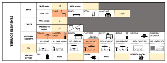 The second section, terrace elements, describes the equipment of the terrace. This section is divided into four subsections: seats, tables, auxiliary elements and heating devices (Figure 14). The seats subsection has three fields: number of seats, number of people occupying these seats and the type of chair. The tables subsection includes two fields: number of tables and use or not of tablecloth (the presence of the meal). The last subsection describes the terrace through their auxiliary elements, in addition to tables and chairs, such as umbrellas, planters, awning, platform, buffet, heating and artificial lighting. With the aim of synthesizing the diversity of terraces regarding equipment, eight modules of terrace are defined, based on the previous work by Pia Giannoni [29]. The description of these modules ranges from a terrace with only tables and seats [M1] to a terrace that becomes a physical extension of its own indoor business [M8]. The last subsection, the heating subsection, is the one that acts as the basis for the analysis of this research. This part seeks to quantify the heating devices installed for every terrace. It contains 3 fields: gas, electric and interior, which describe the type and number of heating devices.
