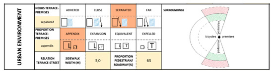 Finally, the last subsection, the terrace–street relation, considers two fields: the sidewalk width where the terrace is located, and the ratio between sidewalk and total street width (considering sidewalks on both sides of the street). In addition to these variables, this section takes into account the environment concept diagram. This diagram aims to present the influence of the terrace over its immediate environment and the reverse.