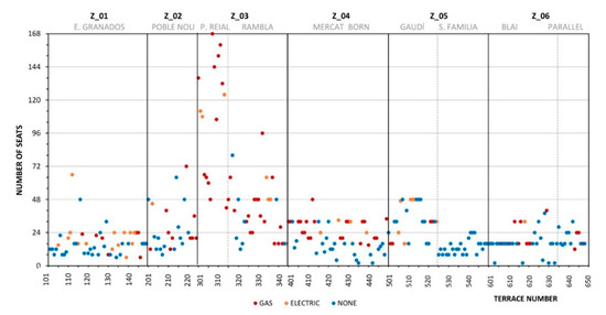 When calculating the total installed power that these terraces represent (3100 kW), gas cylinder heaters are responsible for 97% (3000 kW), while only the remaining 3% (87 kW) is due to the 145 electric heaters. Due to the low percentage of terraces with electric heating devices, the energy analysis presented in the final discussion only considered gas heating values.