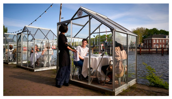 Installation of glazed gazebos at a restaurant’s terrace in Amsterdam motivated by the COVID-19 situation. Photography by Willem Velthoven for Mediamatic Amsterdam, Amsterdam, Netherlands, 2020.