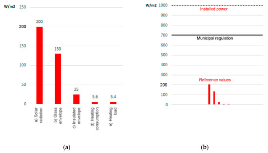 (a) Power (solar radiation flux and other heating reference values) in W/m2; (b) reference values vs. installed power in terraces and current municipal regulation.