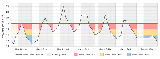 Three values (14, 16 and 18 °C) were set based on existing literature on outdoor comfort [35,36,37]. The number of hours below set temperatures were calculated during the terrace opening hours (Figure 20).