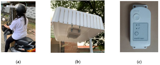 Photos of instruments and facilities used in the mobile observation method. (a) The photo of the instrument set on the mobile platform. (b) The photo of the instrument setting light shield. (c) The air temperature and humidity recorder HOBO MX2301.