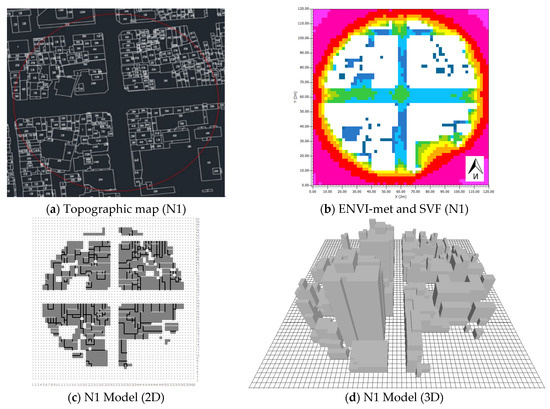 The SVF was calculated based on the building geometry and story height according to a numerical topographic map of Chiayi city [35]. As shown in Figure 3a, the building height was marked in the enclosed area of each building. The building forms, heights, and distribution were first obtained for the area within a 100 m radius of each survey point from the numerical topographic map of Chiayi city. Then, by using those data, the ENVI-met software was employed to establish a 3D model (Figure 3d) and calculate the SVF, and the results are shown in Figure 3b. In detail, the white parts are the buildings, and the other colors indicate the SVF values calculated at the grid (2 m × 2 m) located on the ground floor. Finally, the average of all SVF values obtained by deducting the building parts within a radius of 100 m was taken as the SVF representative values for each survey point.