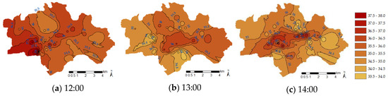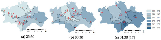 The results of the automotive-mobile observation in the summer of 2018 were obtained using a geographic information system (GIS) to calculate the isothermal lines by using the Kriging method (the black lines in Figure 4 and Figure 5) to present the spatial distribution of the temperature data. Figure 4 and Figure 5 show the survey results of the UHI during each time period in the daytime on 28 July 2018 and at midnight on 30 July 2018. The UHII was evaluated based on △Tu-r (the difference between the highest and lowest temperatures in a specific region during each survey time period), as listed in Table 2. The table indicates that during the daytime, the UHI phenomenon was the most profound at 14:00, and the UHII reached as high as 3.9 °C. At midnight, the UHI phenomenon was the most notable at 01:30, and the UHII was as high as 2.5 °C (please refer to the study of Huang et al. [17] for more details on the spatial distributions of the UHI and urban land-use pattern).