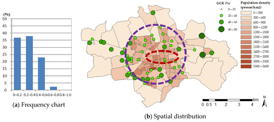 Figure 6 shows a summary of the analysis results of the GCR. The results indicate that at most of the survey points (i.e., 65 points or 75% of the survey points), the GCR was 0–0.4. In addition, at 23% of the survey points, the GCR was 0.4 to 0.6, whereas at only 2% of the survey points (or 2 survey points), the GCR was higher than 0.6 (Figure 6a). Figure 6b also shows the spatial distribution of the GCR. It was found that the closer the survey point occurred to the train station (the area enclosed by the red dotted line) and downtown area (the area enclosed by the purple dotted line), the lower the GCR was (<0.2). Conversely, the closer the survey point was to the rural area (the area outside the two enclosed areas), the higher the GCR was (>0.4).