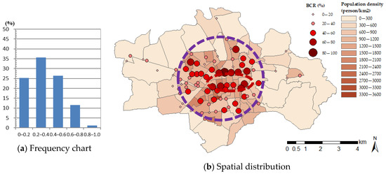 Figure 7 shows an overview of the BCR analysis results. The results reveal that at most survey points (i.e., 53 points or 61% of the survey points), the BCR was 0–0.4. In terms of the remaining points, at 26% of the survey points, the BCR was 0.4 to 0.6, whereas at only 12% of the survey points, the BCR was higher than 0.6 (Figure 7a). Figure 7b also reveals the spatial distribution of the BCR. When the survey points were located close to the train station and downtown area, the BCR increased to 0.4 or greater. Conversely, when the survey points were closer to the boundary of the city and rural area, the BCR decreased to 0.2 or lower.
