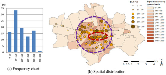 Figure 8 shows a summary of the FAR analysis results. The results indicate that at 50% of the survey points, the FAR was lower than 100%. Among the remainder, 20% of the survey points had an FAR of 100–150%, 13% of the survey points had an FAR of 150–200%, and 17% of the survey points had an FAR of 200–250% (Figure 8a). Figure 8b also shows the spatial distribution of the FAR. When the survey point was located close to the train station and downtown area, the FAR greatly increased to 150% or greater. Conversely, when the survey point was located close to the boundary of the city and rural area, the FAR decreased to 100% or lower.