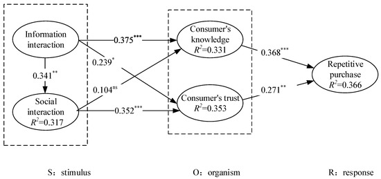 - Consumer knowledge plays a partial mediating role between information interaction and repetitive purchase, while there is no mediating effect between social interaction and repetitive purchase. This may be why the dissatisfaction of consumers in acquiring product knowledge is to find solutions to specific problems, emphasizing practicability, and less involving emotional factors. However, social interaction affects emotional communication, which meets the psychological needs of consumers. The two functions are not consistent, so consumer knowledge does not produce a mediating role between social interaction and repetitive purchases [82]. Consumer trust plays a partial mediating role between information interaction and repetitive purchases while playing a complete mediating role between social interaction and repetitive purchase. It may be because consumer trust is an emotional compensation for product perception. Social interaction can increase emotional communication between consumers and make up for dissatisfactory consumers’ negative purchase experience [42]. Hence, the mediating role of consumer trust is more obvious, which completely mediates the influence of social interaction on repetitive purchases.