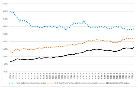 Ratio of facilities, intellectual property products, and research and development (R&D) investment to gross capital formation using quarterly data. R&D investment is included in intellectual property products investment. Data: Bank of Korea Economic Statistics System (source: https://ecos.bok.or.kr, downloaded 6 November 2020).