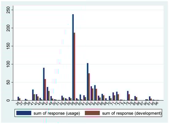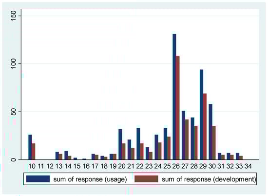Figure 3 and Figure 4 show the sums of positive responses to the question of whether a firm has adopted or developed any Fourth Industrial Revolution technologies at the two-digit industry code level for the manufacturing and service sectors, respectively. Figure 3 shows that manufacturers of electronics (industry code 26), other machinery and equipment (industry code 29), and motor vehicles and trailers (industry code 30) are active in adopting and developing such technology. Figure 4 shows that firms in publishing activities (industry code 58) and computer programming (industry code 60) have actively adopted and/or developed such technology. These figures indicate the existence of sectoral heterogeneity in the degree of technology adoption.