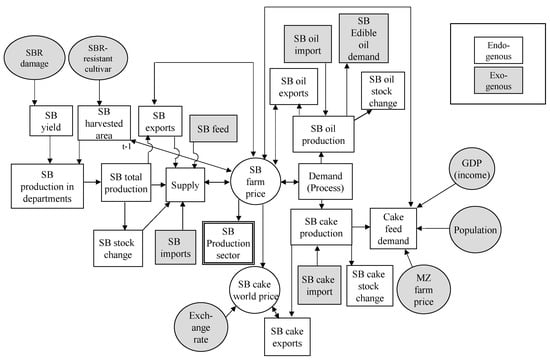 Flowchart illustrating the econometric supply and demand model for soybeans in Paraguay. Legend: SB = soybean; SBR = soybean rust; MZ = maize.