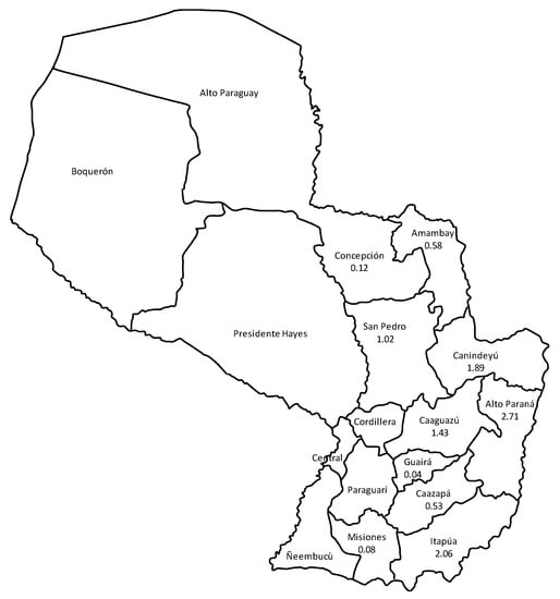 Department-based production is shown in Figure 2. The departmental levels of Yi and Ai for soybeans in Paraguay were obtained from the Paraguayan Grain and Oilseed Merchandizers and Exporters Association (CAPECO) []. The following data for the whole country were obtained from the Food and Agriculture Organization Statistical Database (FAO-STAT) []: Y, A, sbFP, sbEX, sbSTC, sbFE, sbIM, sbQ, sbPR, oilQ, oilEX, oilIM, oilSTC, oilED, cakQ, cakEX, cakFE, cakIM, cakSTC, mzFP, GDP, and POP. The data for CPI, EXR, and cakWP were obtained from the World Bank (WB) [].