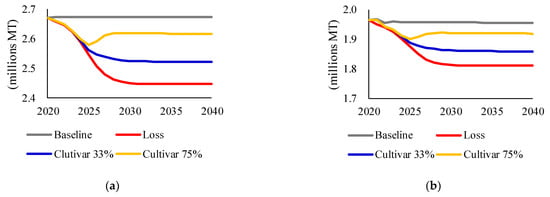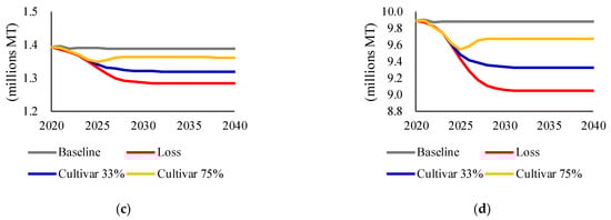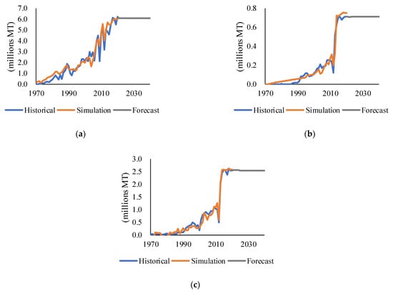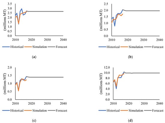 Over half (60.8%) of the soybeans produced in Paraguay was exported as grain and 38.2% was processed as of 2020 []. Oil is extracted from processed soybeans and is exported, leaving the residue known as soybean cake. In Paraguay, domestic consumption of soybean cake as stock feed is relatively small; 17.8% of it was used for feed as of 2020 []. Figure 4 shows the simulation results for exports of soybeans and soybean products. In 2013, exports of soybean products increased sharply (Figure 4) due to three main reasons []. First, the crushing company using Paraguayan soybeans improved their infrastructure by means of adding large crushing plants and grain terminals. Second, a new law allowed public–private alliances, which enabled the expansion and improvement of the public infrastructure. Third, the Paraguayan government eliminated the 10% export tax on soybeans and replaced it with a value-added tax (5%) on all agricultural products. Thus, exports of soybeans, oil, and cake will stabilize at approximately 6.07, 0.71, and 2.55 million MT, respectively, by 2040.