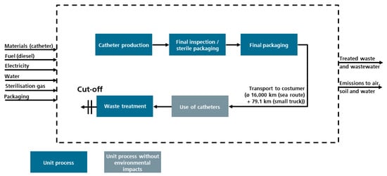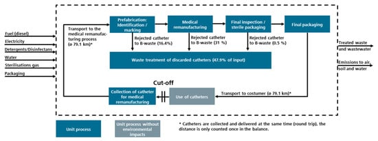 All rejected catheters that were sorted out due to failed identification, failed functional test after medical remanufacturing, or failed sterile packaging are included and are treated as municipal waste according to the reference process (waste treatment of discarded catheters in Figure 3). The proportion of remanufactured catheters leaving the process after final packaging per all collected catheters entering the identification process step is aggregated to 52.1% (and consequently 47.9% losses). In the final packaging step, the products are packed into the item-specific outer packaging, and the product labels are generated and applied. After the catheter is used in hospitals, a cut-off is placed as we assume that catheters from hospitals that participate in the medical remanufacturing process are collected again for remanufacturing. In line with the reference process from virgin production, all material and energy demands are modeled, starting with the provision of raw materials. Further modeling choices and assumptions regarding the life cycle inventory are discussed in Section 2.1.2.